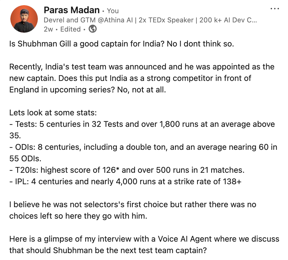 Instead of cold-launching and trying to create a demand, insert yourself into existing conversations. For example, we used the Fifa worldcup to introduce our AI product for sports commentary. During Athina’s launch of Dialog, we framed our pitch around how a new captain for Indian Cricket Team was not the right choice and it clicked hard.